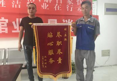 事后,業主的兒子回到家中,看到已經整理好的衛生間后非常感動,于2018.9.12專門制作了一面錦旗送到了物業辦公室,以表感激之情。