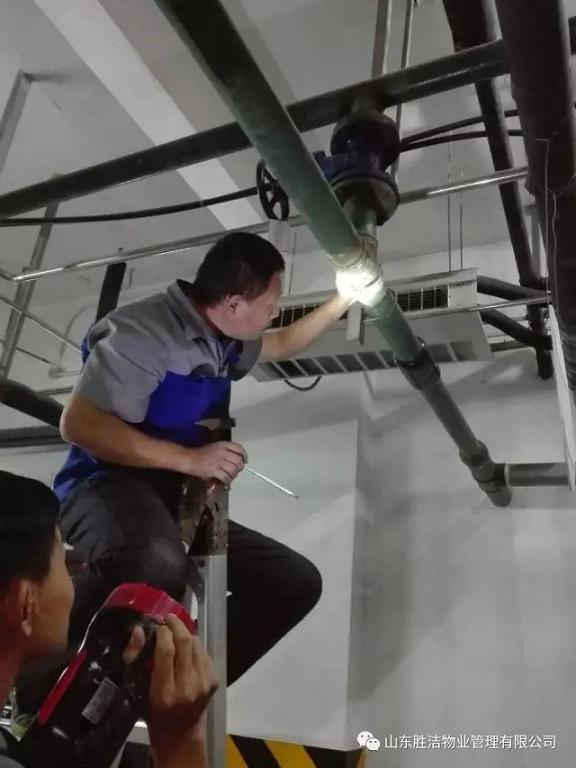行政辦公中心的工程師傅們趕在節前維修地下車庫13號車位上方管線的漏水,讓業主可以安心停車。