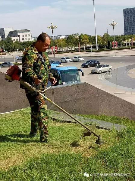 行政辦公中心前的三十六級臺階也是大樓的組成部分,勝潔物業的綠化師傅們為草坪打草梳妝,讓大樓看起來更加屹立挺拔。