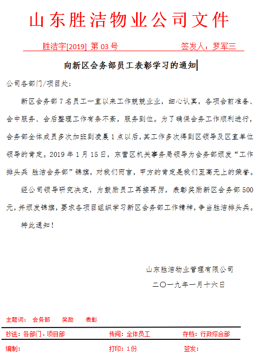 同時(shí),勝潔物業(yè)公司總部號(hào)召全體員工以會(huì)務(wù)部為榜樣,學(xué)習(xí)會(huì)務(wù)工作精神,團(tuán)結(jié)協(xié)作、愛崗敬業(yè)、人人爭當(dāng)排頭兵!