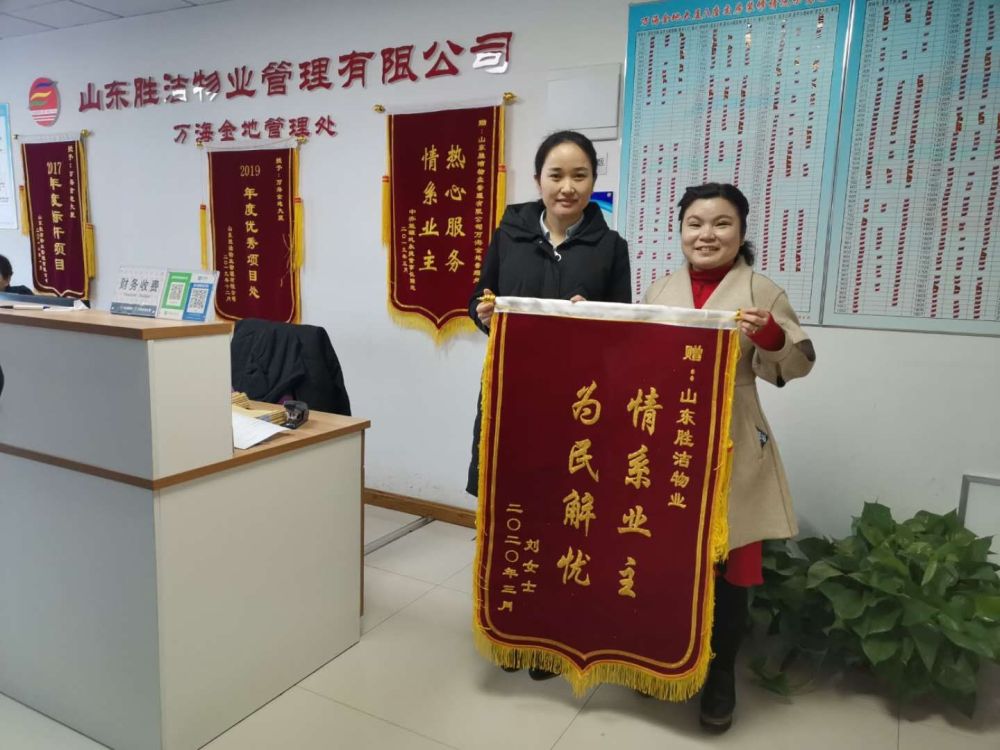 由于不明確丟失手機具體位置,所以當天調取監控并未發現手機。但是第二天在物業監控員吳廣北的不懈努力下,從劉女士下車到上樓仔細查找,終于在車場新安裝的一處高清攝像頭下發現有人在連廊處撿到此手機,吳師傅立即報告祁主管,聯系丟失手機的劉女士一同查看監控,通過大廳、電梯、樓層等多處攝像頭終于確定了撿到手機的人員。在祁主管和客服王桂蘭溝通協調處理下,歷經兩天周折,手機終于安然回到劉女士的手中,劉女士特別感動,為感謝物業人員的不懈努力和辛苦付出,特贈送給萬海金地物業管理處一面錦旗——為民解憂 情系業主!