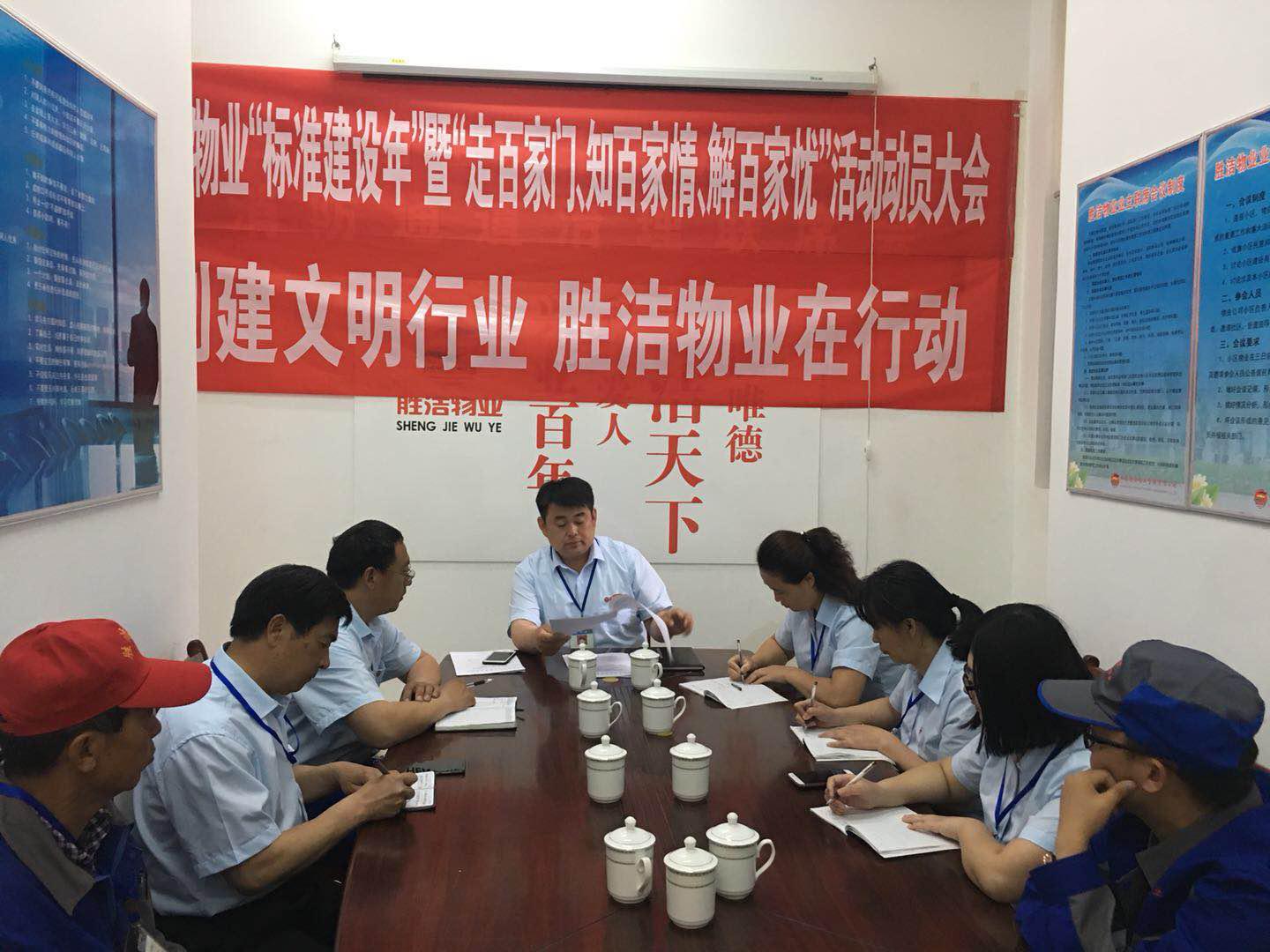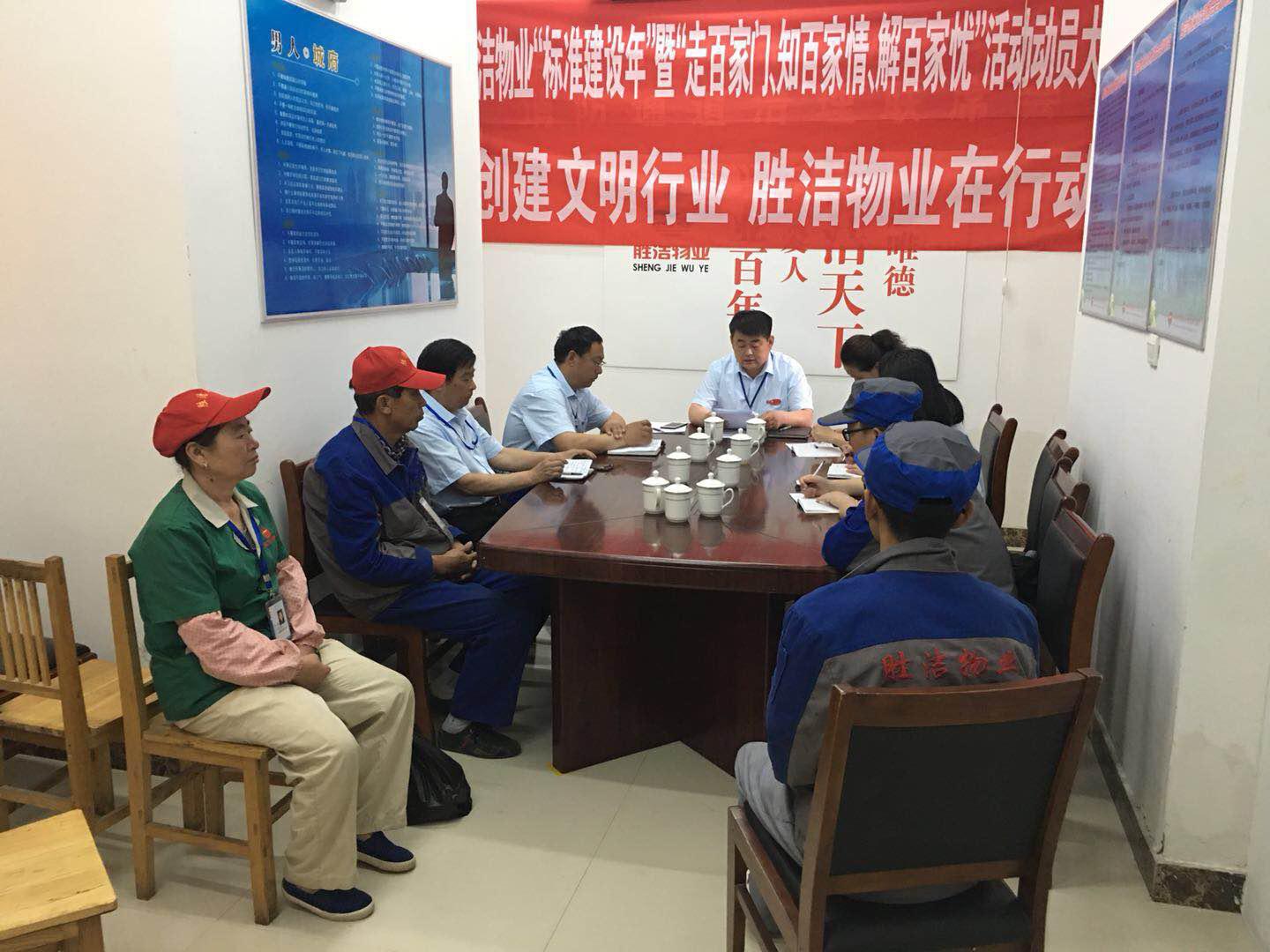 2018年5月11日,勝潔物業悅來新城項目處召開“標準建設年”暨“走百家門、知百家情、解百家憂”活動動員大會,項目經理、各部門主管、班長及所有維修人員參加了會議。