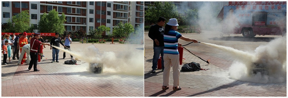 消防人員講解滅火器,并現場示范,項目員工以及小區業主認真觀看學習